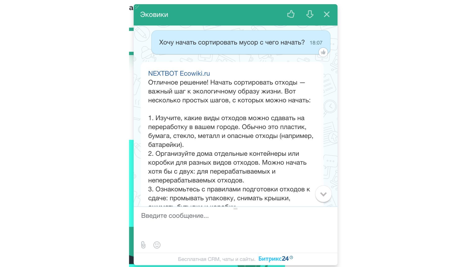 - Помогает действовать: например, подсказывает, как начать сортировать отходы, участвовать в экофлешмобе или провести урок в школе